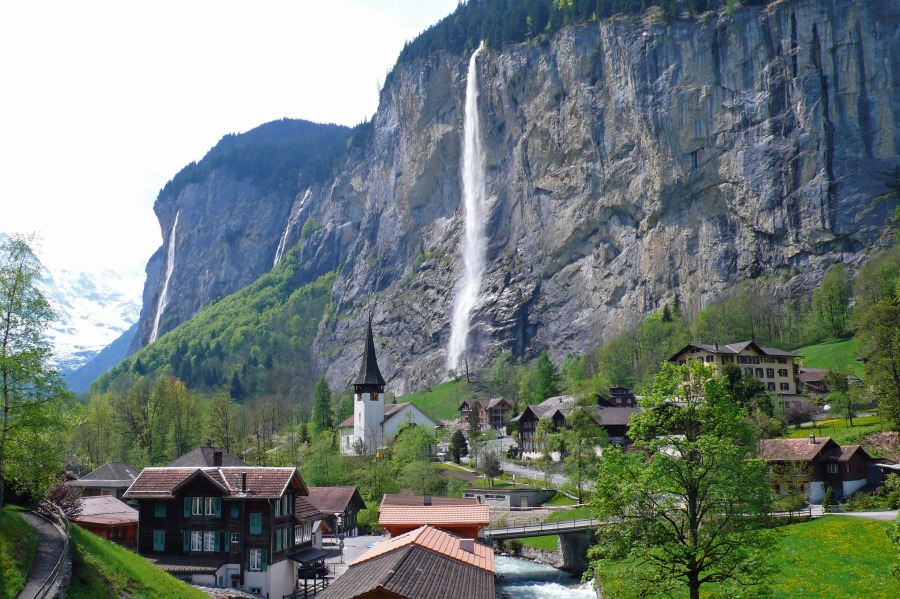 라우터브루넨 계곡은 72개의 멋진 폭포가 환상적인 분위기를 자아내는 곳이에요. 울창한 녹지와 고산 초원으로 둘러싸인 이곳은 등산객과 자연 애호가들의 천국이라고 불리죠.